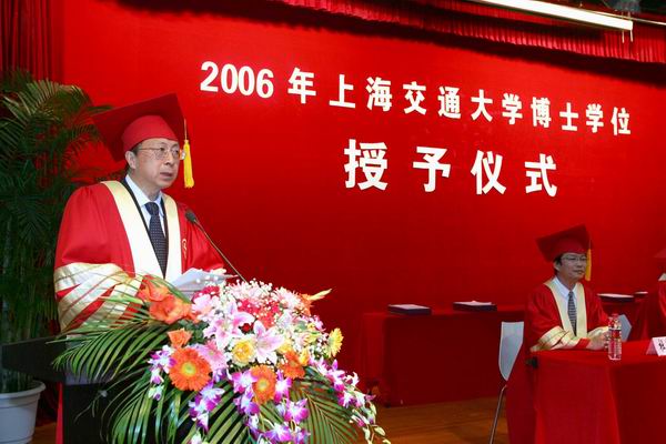 上海交大2006年博士学位授予仪式10月21日隆重举行。党委书记马德秀、校长谢绳武、副校长印杰、中国科学院院士贺林、研究生院副院长杜朝辉出席仪式,向秋季毕业博士授予学位。
