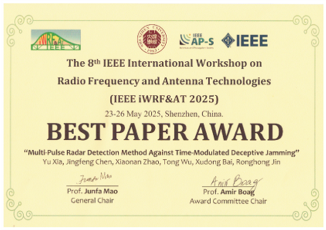 本次会议分为34个主题,共颁发最佳论文奖5个。上海交通大学集成电路学院(信息与电子工程学院)现代天线研究中心金荣洪教授课题组投稿的论文“Multi-pulse Radar Detection Method against Time-modulated Deceptive Jamming”(抗时间调制欺骗式干扰的多脉冲雷达探测方法)荣获最佳论文奖。