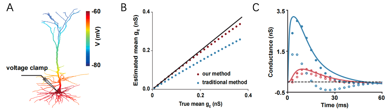 神经元的大部分突触均分布在树突上,由于实验技术的限制,难以直接对它们进行测量。因此,在传统实验中,研究者通常采用在细胞体处施加电压钳的方法,通过调控神经元胞体处膜电位并测量相应电流来估计树突远端的突触电导。然而,这一方法的有效性基于“等电势”假设,即神经元胞体处的电压控制可以使得电压在整个树突结构中保持相同。但实验发现,这一假设在真实神经元中并不成立。人们在胞体处施加的电流在向树突传播过程中会衰减,导致远端树突处的电压无法被完全钳制,如图A所示,这种现象被称为空间钳效应(space clamp effect)。空间钳效应会引入系统性误差,使得传统方法估计的突触电导偏离真实值,甚至可能得到非物理的负电导,从而影响人们对众多实验现象的理解。这一问题长期以来一直是神经元电生理测量中的一个重要挑战。
