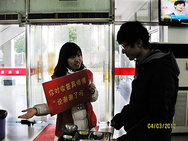 无独有偶,一批来自数学系的志愿者也把目光聚焦在了校园里,只是他们的目的地是学子们再熟悉不过的食堂。摆餐盘、管秩序……志愿者们忙得不亦乐乎。他们还别出心裁地在食堂醒目处贴上了“你说谢谢了吗”的标语,提醒学子们牢记感恩。“参加这次公益服务让我真正体验到了这些后勤人员的辛苦,更重要的是懂得了感恩和尊重。”数学系的一名本科生说。