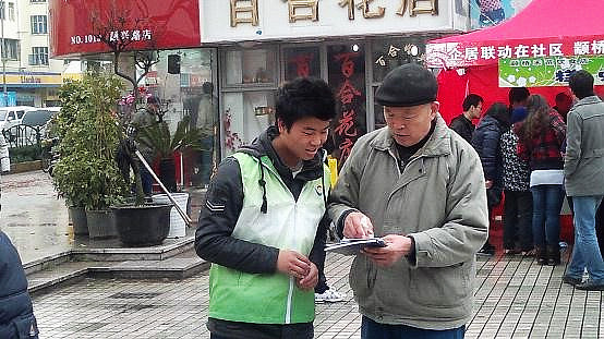 柳萌和谷诚博都是交大翡翠丝带社的成员,这个主要由药学院学子组成的公益社团平时致力于宣传肝病防治,在“学雷锋日”之际,他们走上了街头,一方面为市民们义务测量血压,另一方面,通过组织肝病知识问答、发送肝病知识手册等各种形式干起“老本行”,向老百姓普及肝病知识,提供相应的健康状况评估和饮食指导。现场人头攒动。