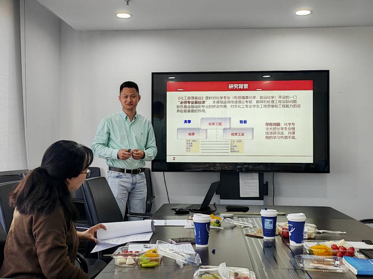 2024年度学院教学研究基金聚焦化工系专业课程建设与人才培养,是学院响应学校“教育思想大讨论”、共商“新时代一流化工人才何以炼成”的阶段性答卷。会上,5位项目负责人围绕PBL-TBL-FC混合式教学、案例式教学法、工程思维在科研工作中的植入、翻转课堂教学模式的运用及AI赋能课堂等主题,依次汇报实施路径、数据成效与持续改进方案,并现场回答专家提问。评审组从问题的提出与解决、课程目标的凝练与实现、教学设计的合理性以及考核指标的优化等方面进行了评定并提出了宝贵的建议。
